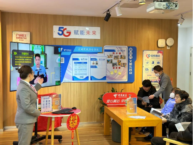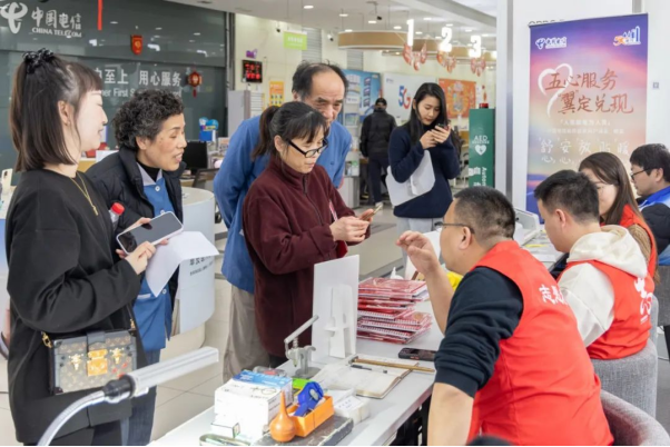 3月5日,上海电信全城营业厅同步开展学雷锋活动,用户在家附近的任一电信营业厅都可以享受到防诈知识科普、业务咨询、手机辅导等一系列服务。在四川北路营业厅,各“雷锋服务”摊位前,围着不少前来办理业务的用户,除了传统的业务咨询和手机辅导外,居民们还可以享受手机免费贴膜、防诈宣传、智家体验等服务。值得一提的是,为了让大家更好地理解和使用智能设备,现场还有专业人员进行智家体验展示,让科技更好地服务于每个家庭。家住四川北路附近的张阿姨很高兴:“今天的服务内容实在丰富,还有修手表、修眼镜,我的老花镜镜架螺丝有点松动,正好拿过来修一下。师傅维修的时候,营业员还给我讲了反诈常识,电信真的是用心为我们老百姓服务。”